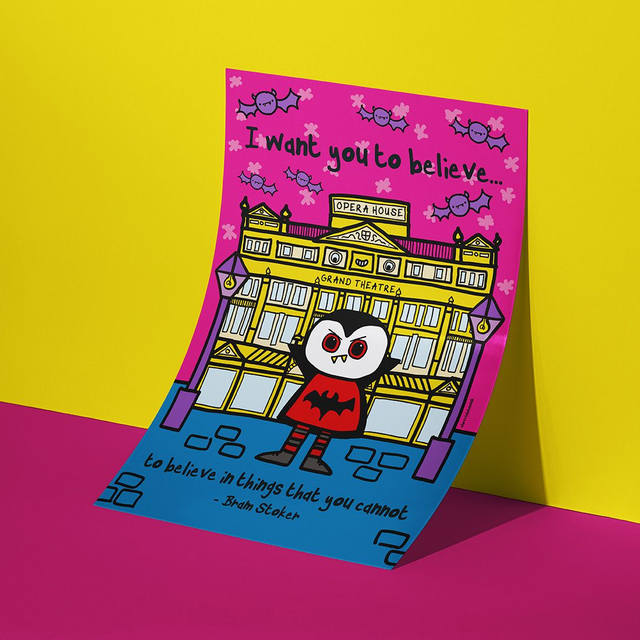 Bring home a burst of colour, character, and Derby heritage with this vibrant art print. Inspired by Derby’s unique place in literary history, this print also nods to a remarkable local moment on the 15th May 1924, the world premiere of Dracula took place at The Grand Theatre on Babington Lane in Derby. A reminder to stay open, stay imaginative, and stay wonderfully yourself.